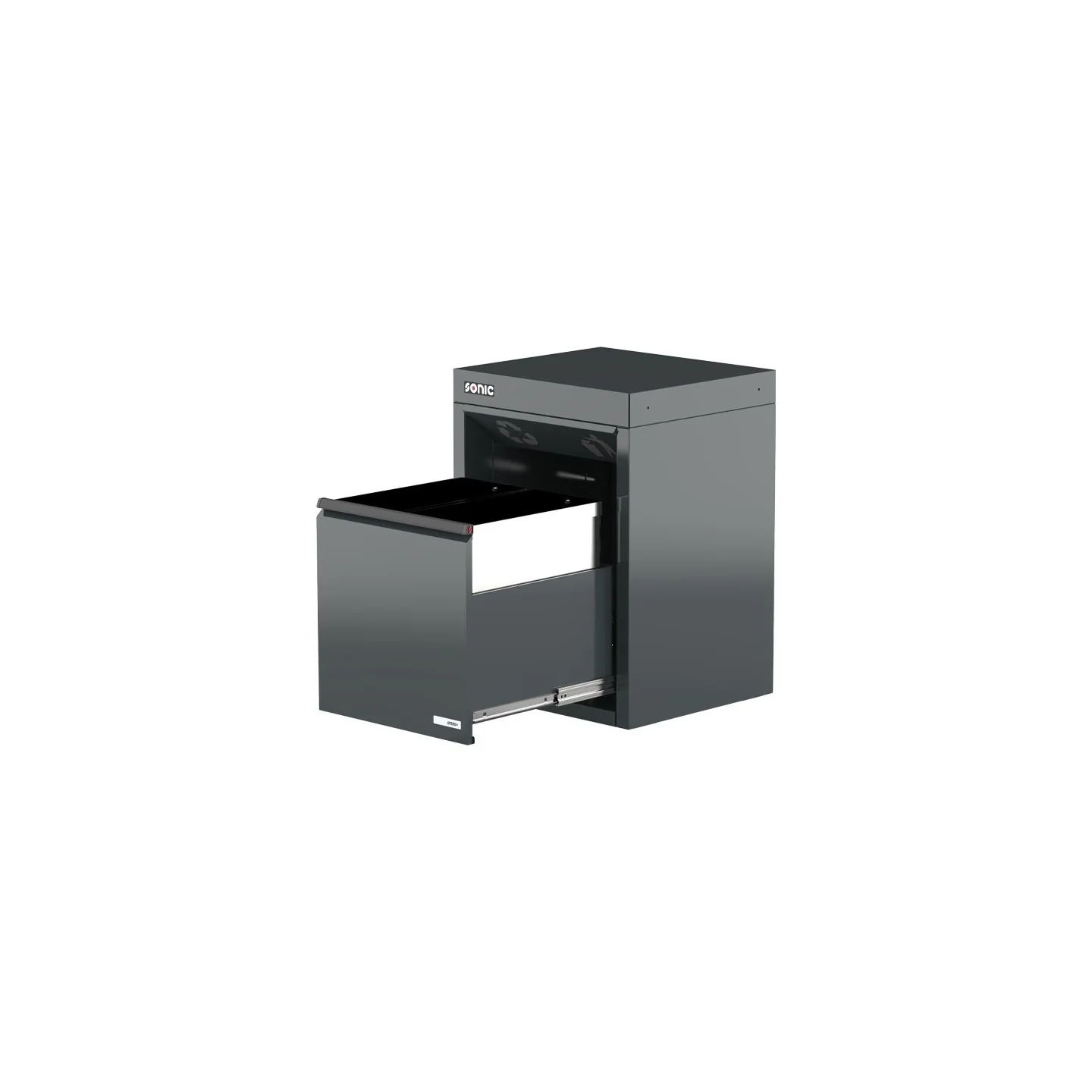 The 720mm waste bin/recycle cabinet is equipped with heavy duty drawer slides with a load capacity of 230kg. With the easy push valve and integrated stainless steel waste bins this cabinet is the perfect addition to every workplace.