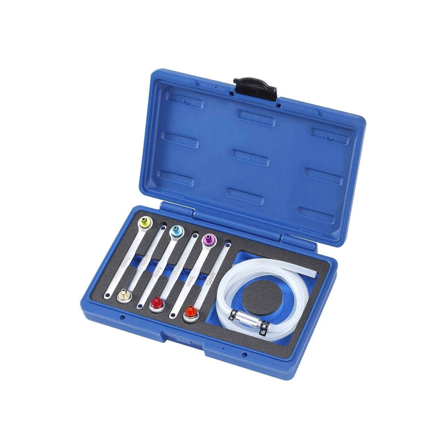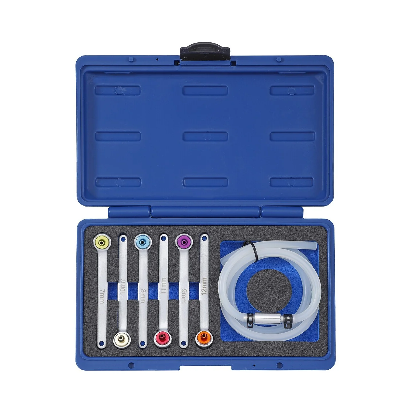 7-8-9-10-11-12mm all color-coded for easy identifi cation. Ideal for both brake and clutch hydraulic systems, the wrench set is supplied in a sturdy blow-mould case with internal foam to keep the wrenches and tube secure and tidy.