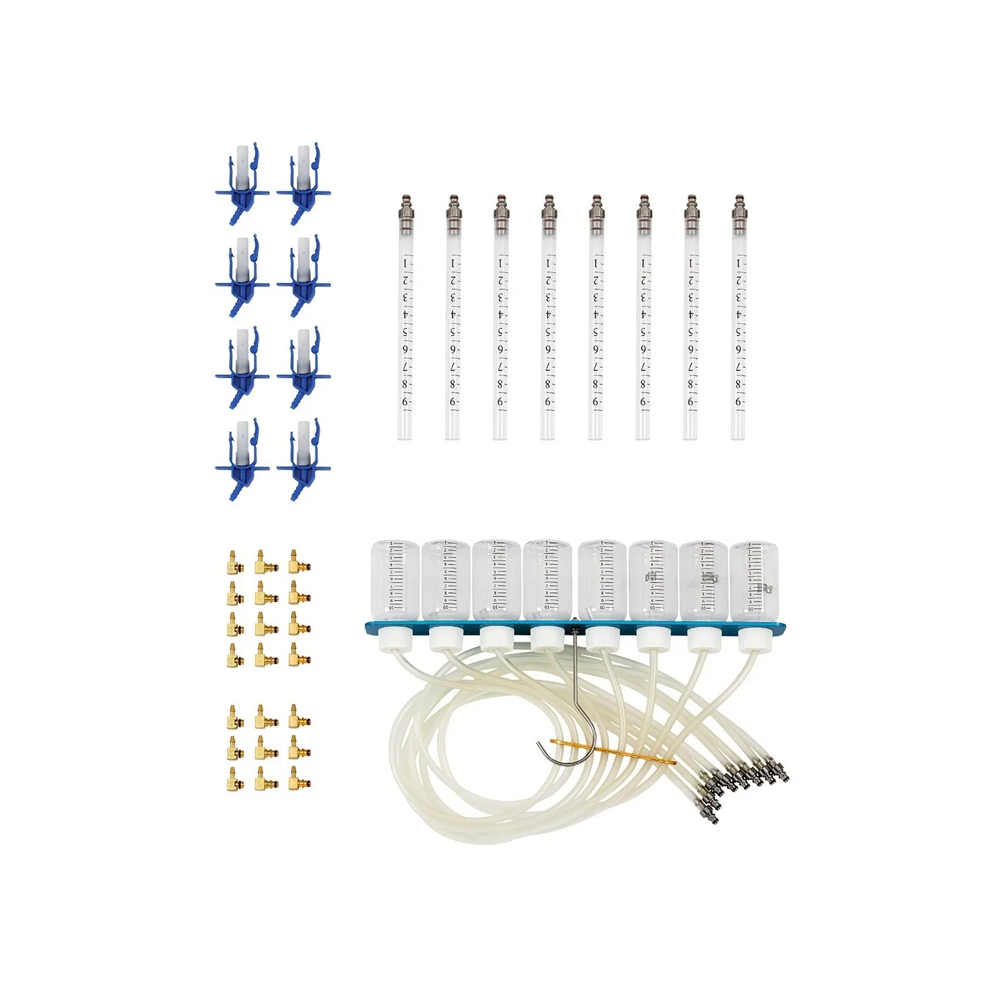 - Includes 8 glass tubes, 8 measurements cartridges with connecting lines, mounted on an aluminum bar