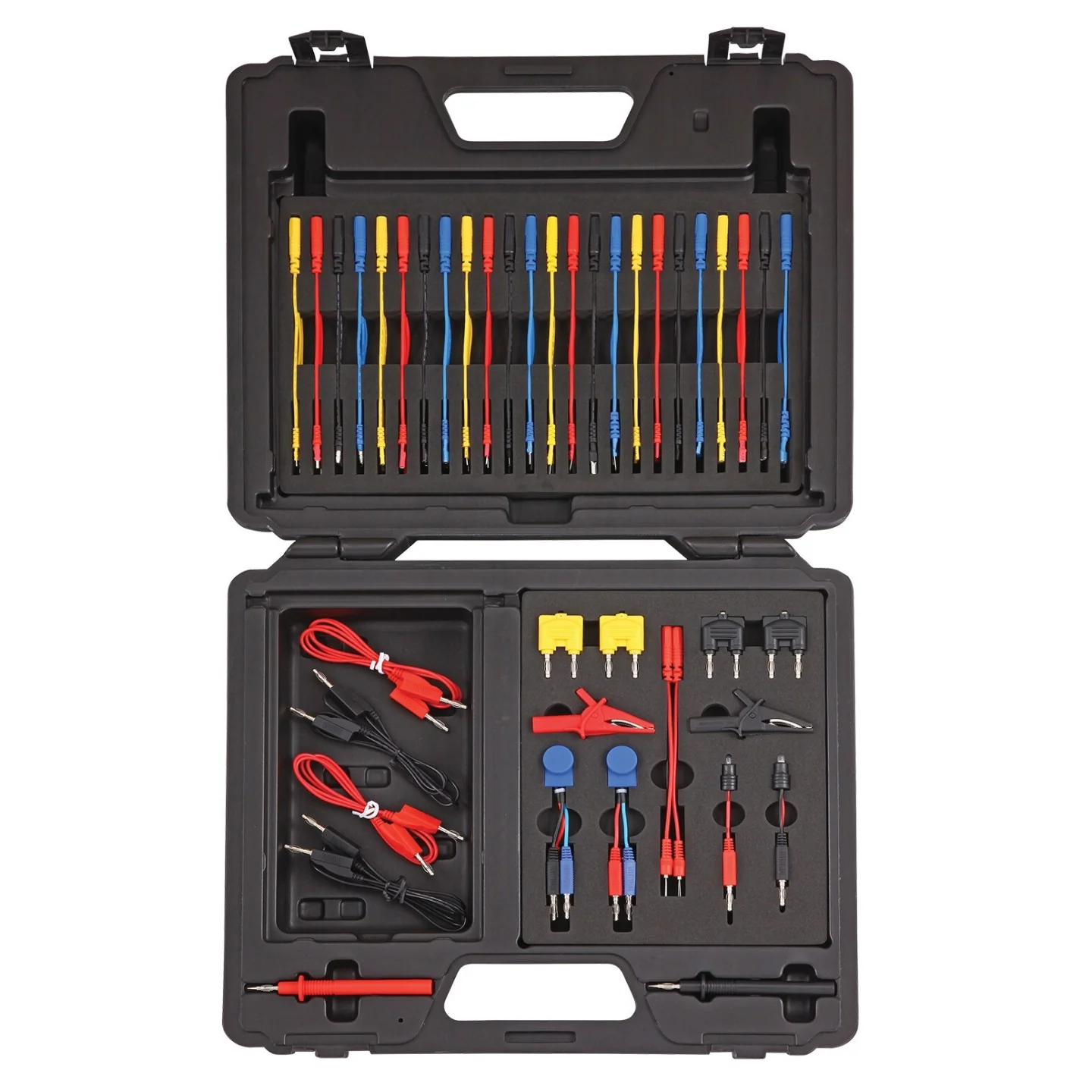 Comprehensive set of test leads and components suitable for testing, isolating and evaluating automotive electronic circuits. Set includes standard Ø24mm banana style plugs and sockets suitable for use with most diagnostic multi-meters and test equipment.