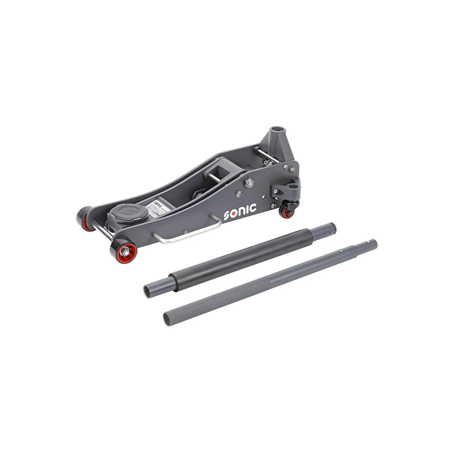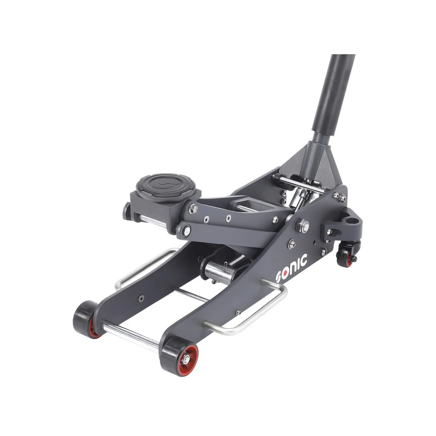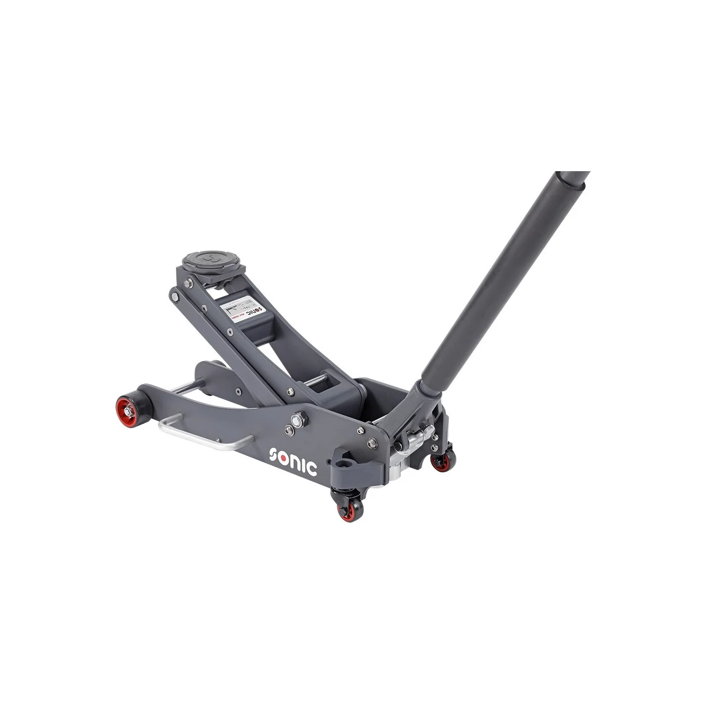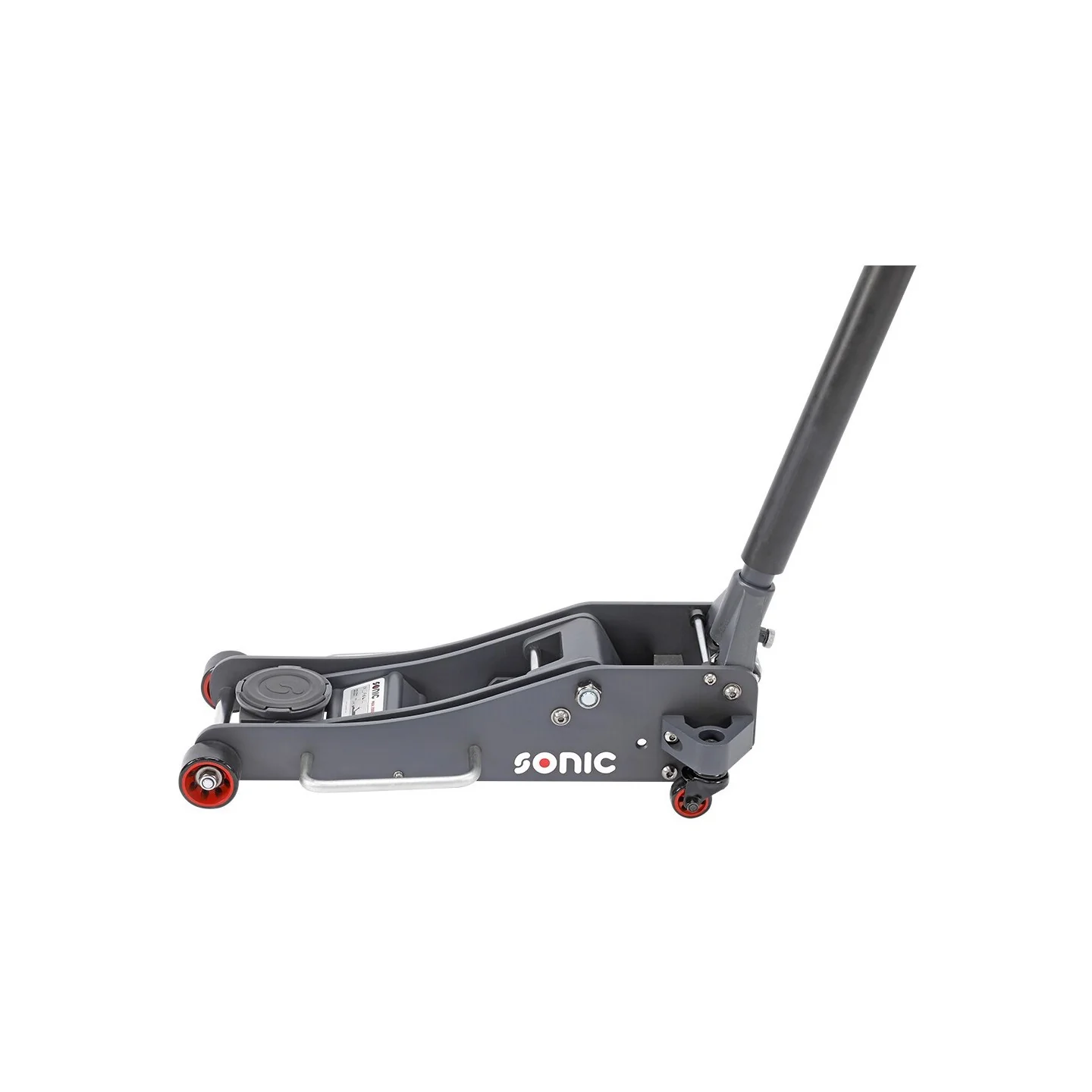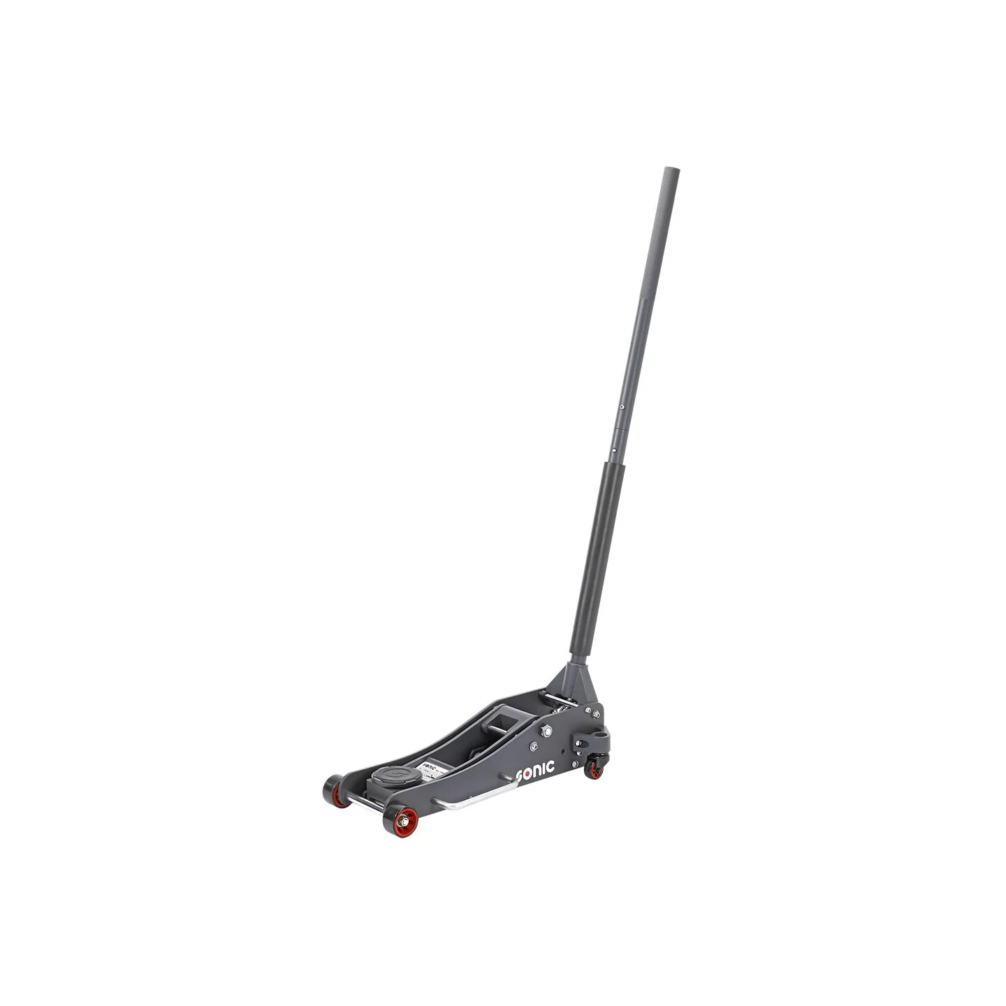 Aluminum jack in an extra low version, with a maximum lifting capacity of 2000 kg. The jack is equipped with nylon wheels (2 swivel wheels) and has a two-part operating rod and a carrying handle. The minimum lifting height is 83mm and the maximum lifting height is 470mm. The total length of the jack is 632mm and the diameter of the pick-up dish 108mm. The jack comes with a rubber pad.