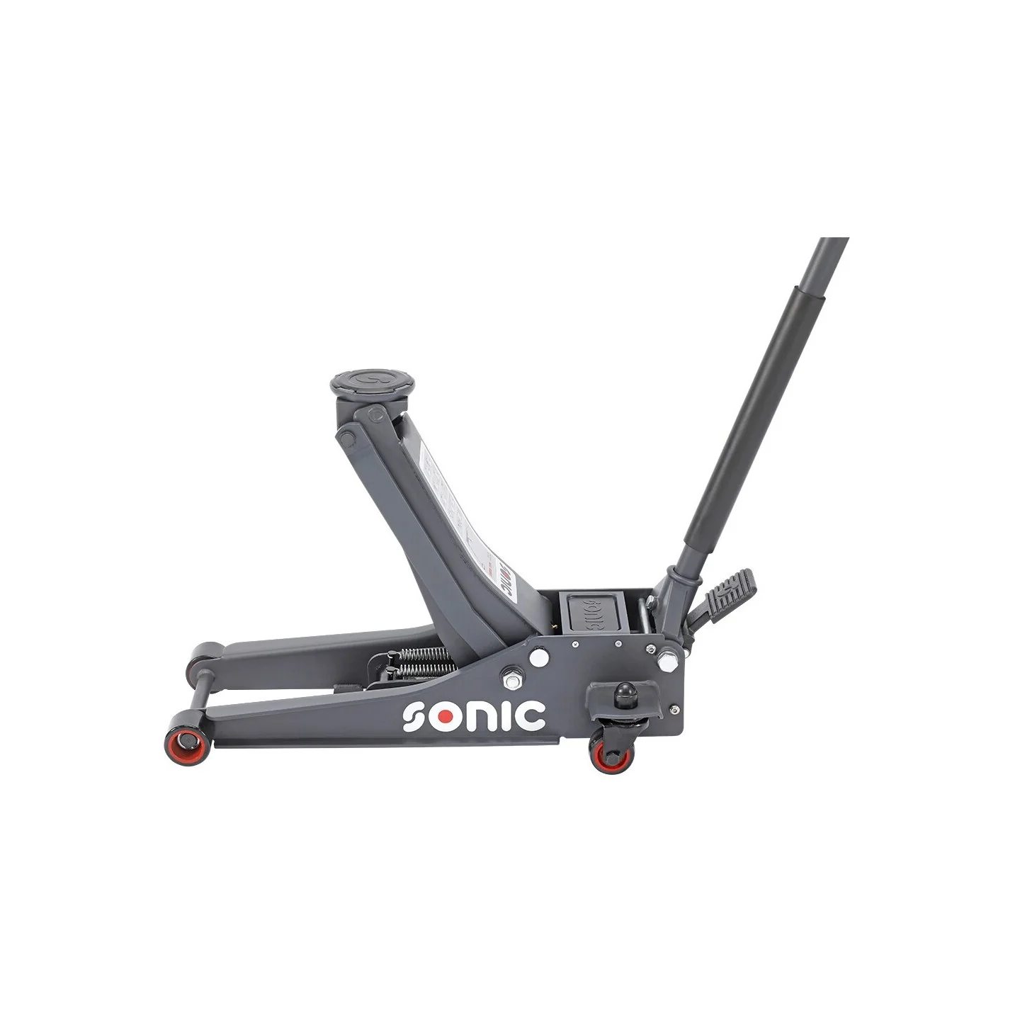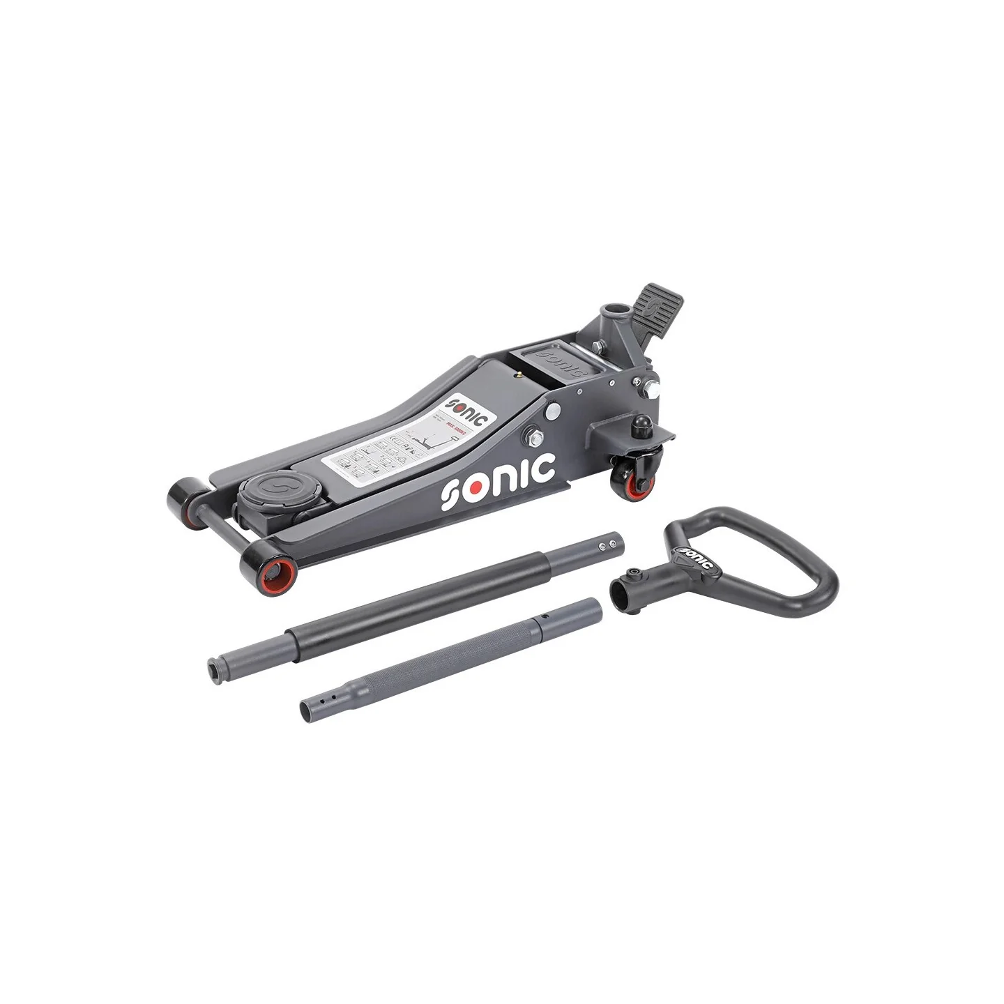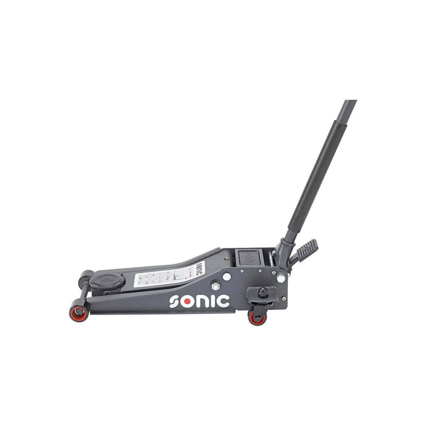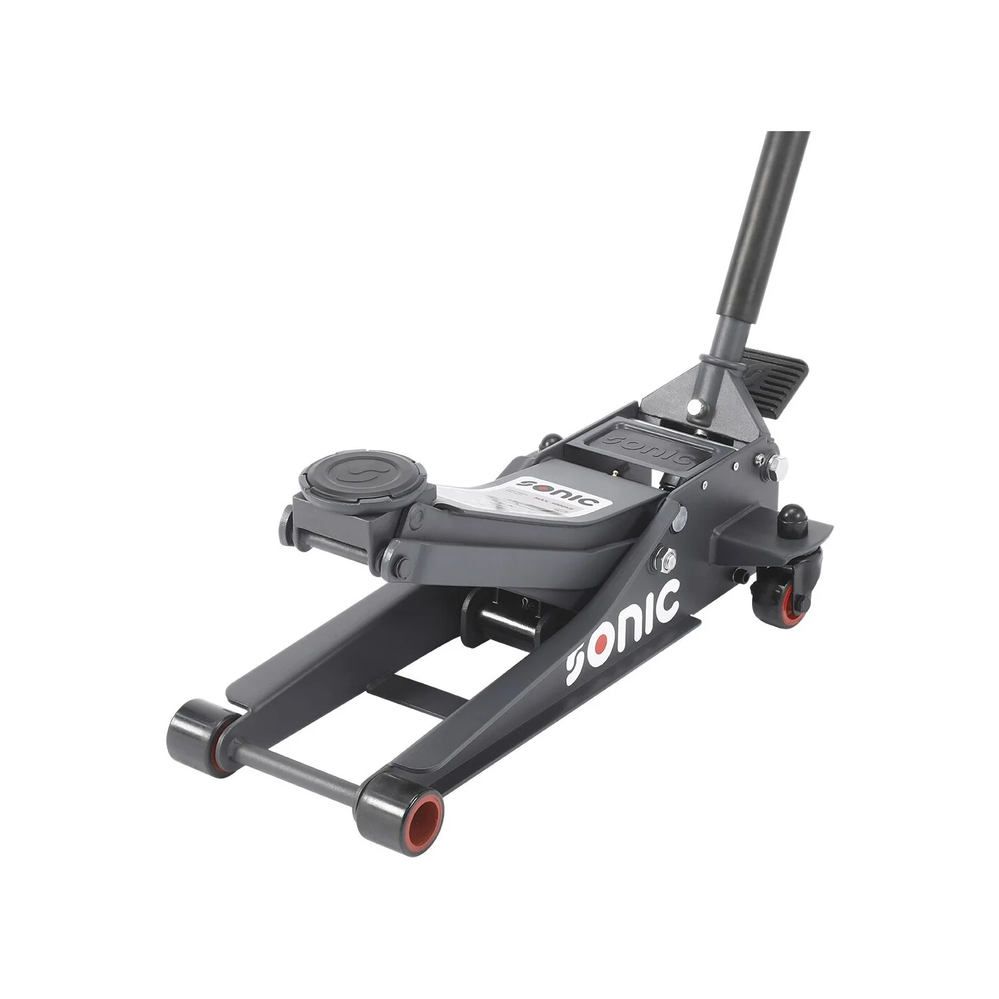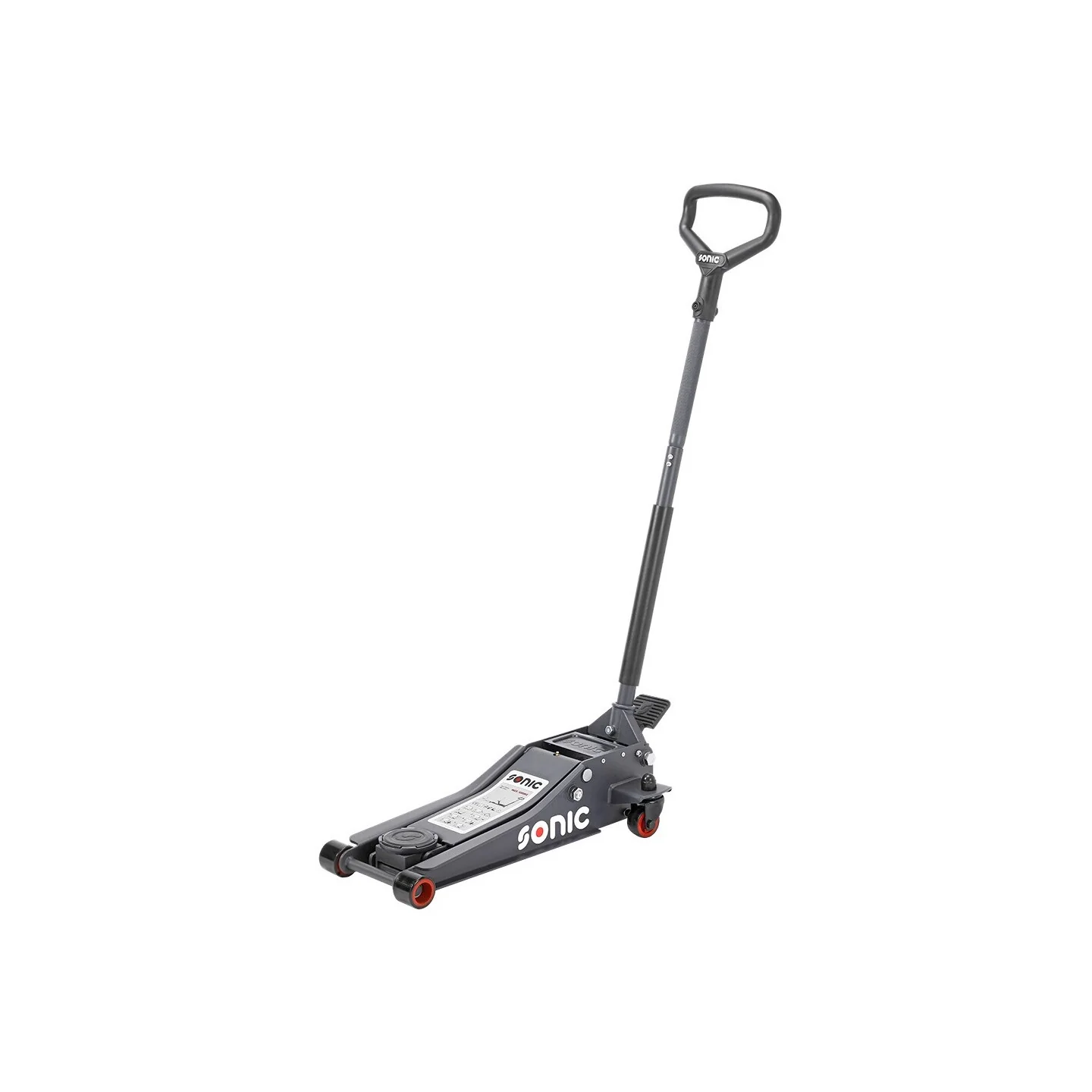 Steel jack in an extra low version, with a maximum lifting capacity of 2000 kg. The jack is equipped with nylon wheels (2 swivel wheels) and an extra foot control. Furthermore, the jack has a two-part operating rod with handle and a protective foam cover. The minimum lifting height is 75mm and the maximum lifting height is 505mm. The total length of the jack is 675mm and the diameter of the pick-up dish 108mm. The jack comes with a rubber pad.