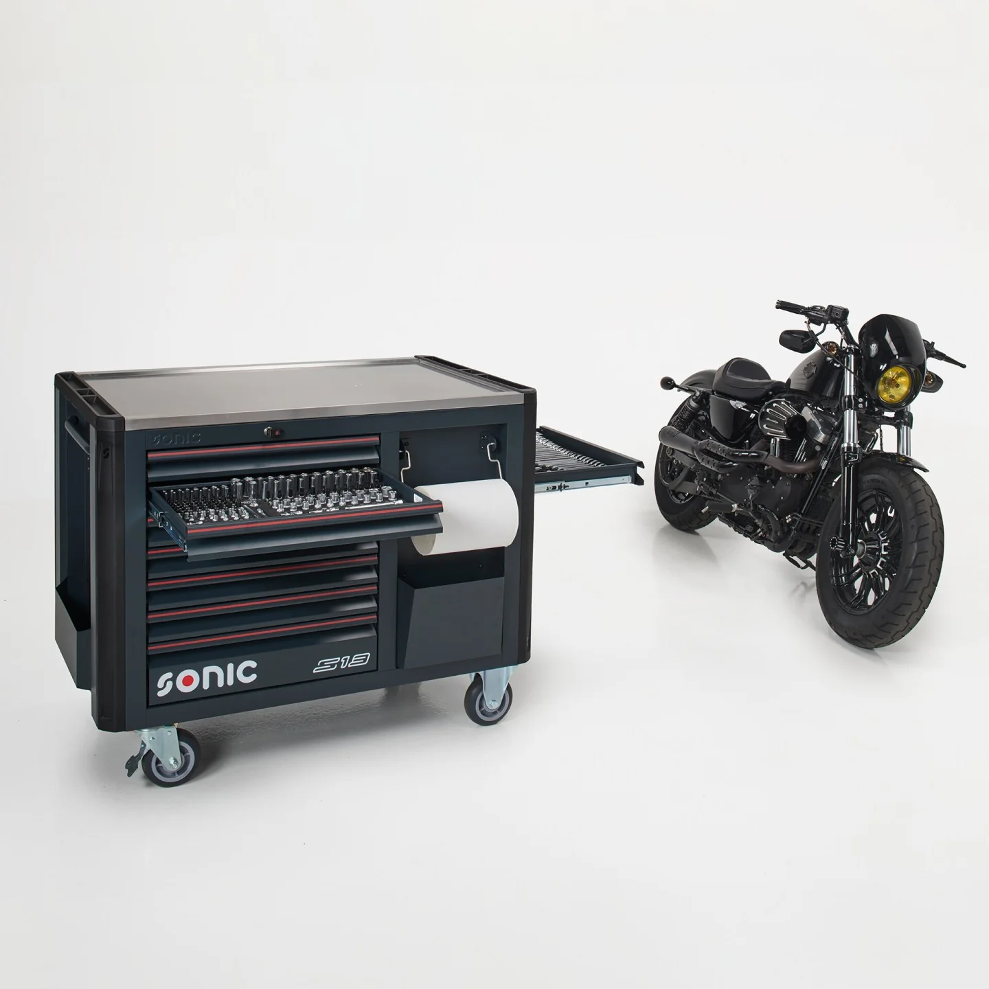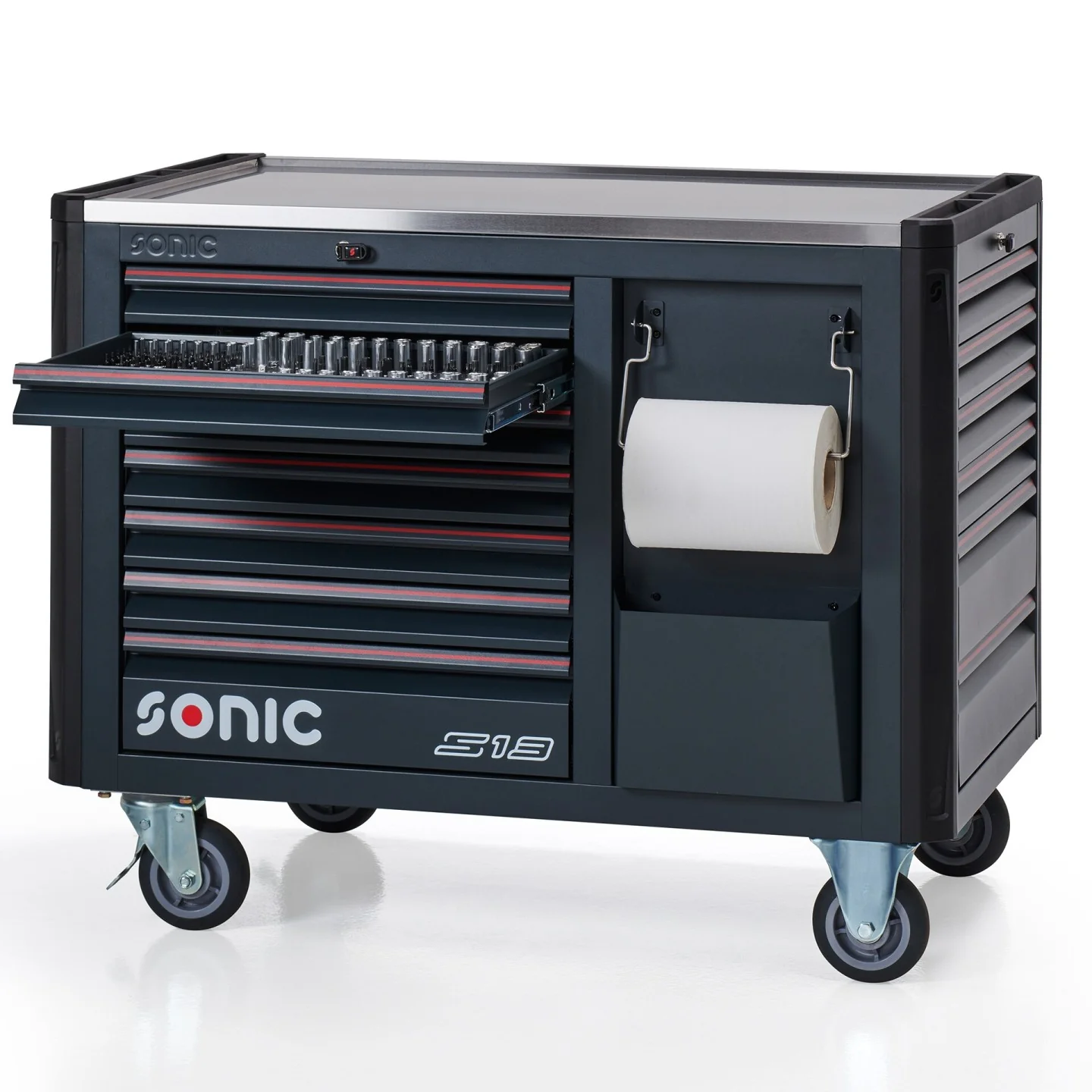 The Sonic NEXT S13 toolbox is the solution of choice for technicians looking for advanced to expert toolsets. The NEXT S13 is a one of a kind toolbox in our lineup. It is short in stature but occupies a large stance at 120cm in width and 76cm in depth. Its larger footprint and ideal work height allow for a unique storage and workspace combination.